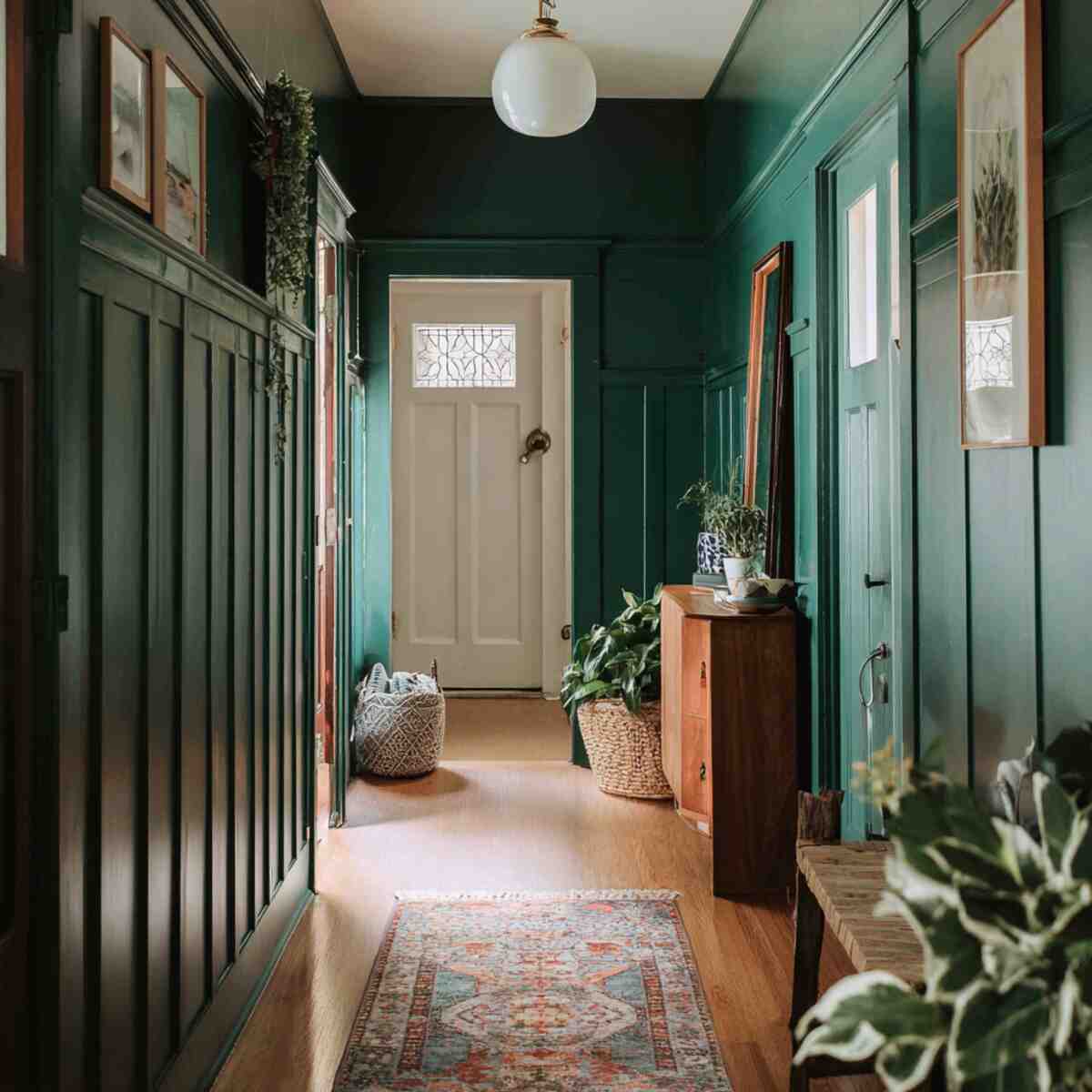 An emerald green board and batten wall brings bold elegance and a sense of luxury to your hallway.