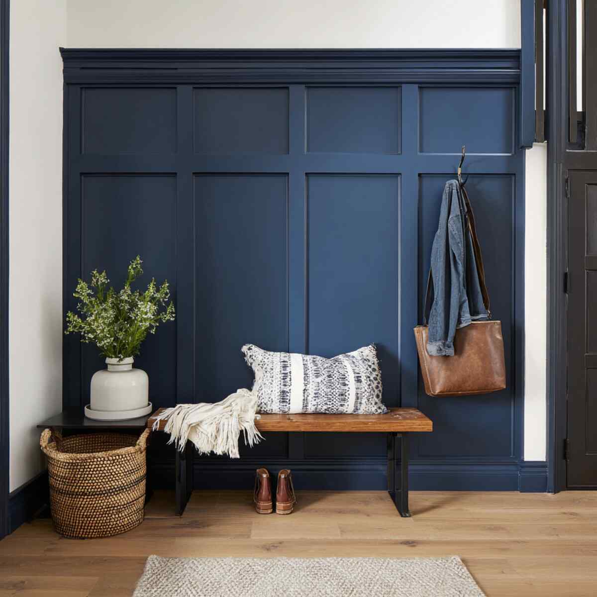 A navy blue board and batten wall makes a bold statement in any hallway. The deep color creates a rich, sophisticated backdrop that pairs well with gold or brass accents.