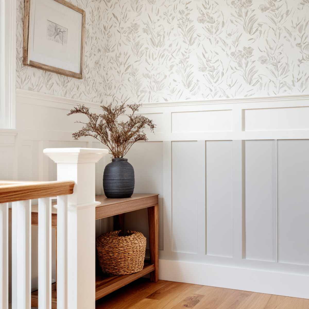 Combining board and batten with wallpaper above adds texture and character to your hallway walls.