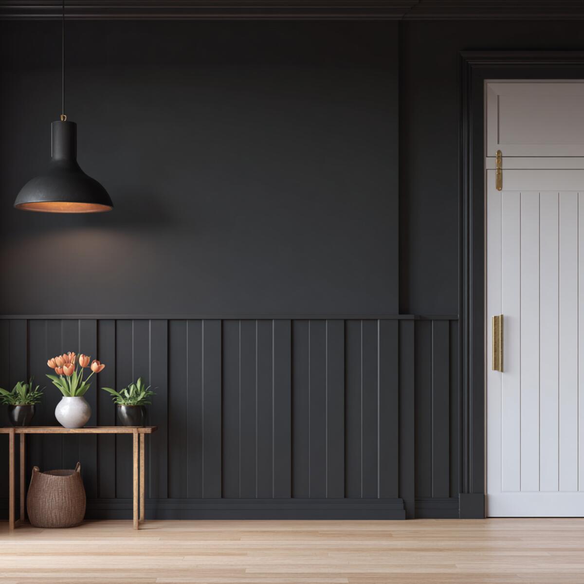 A black board and batten wall delivers modern sophistication with minimal effort. It adds a striking contrast in light-colored hallways, making décor and lighting pop.