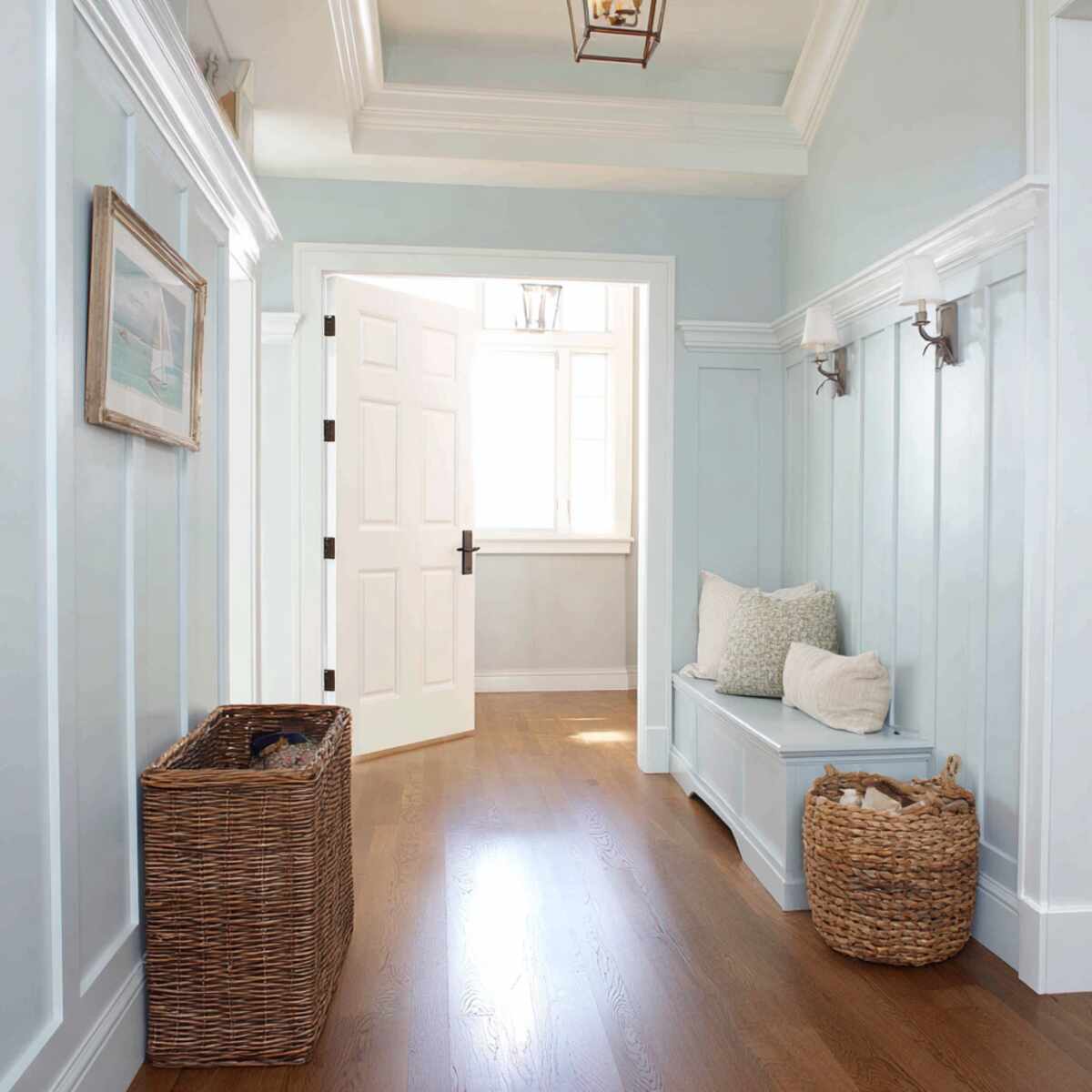 A light blue board and batten wall instantly gives your hallway a calm, seaside vibe.
