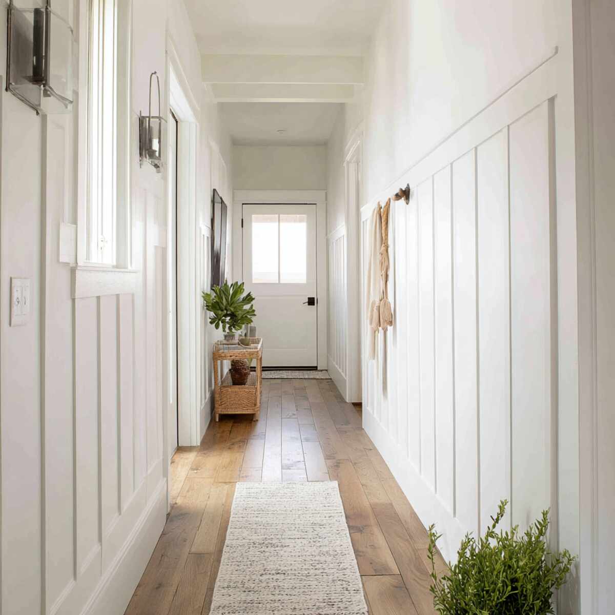 A classic white board and batten wall brings a timeless charm to your hallway. This clean and simple design brightens up the space, making narrow hallways feel more open and inviting.