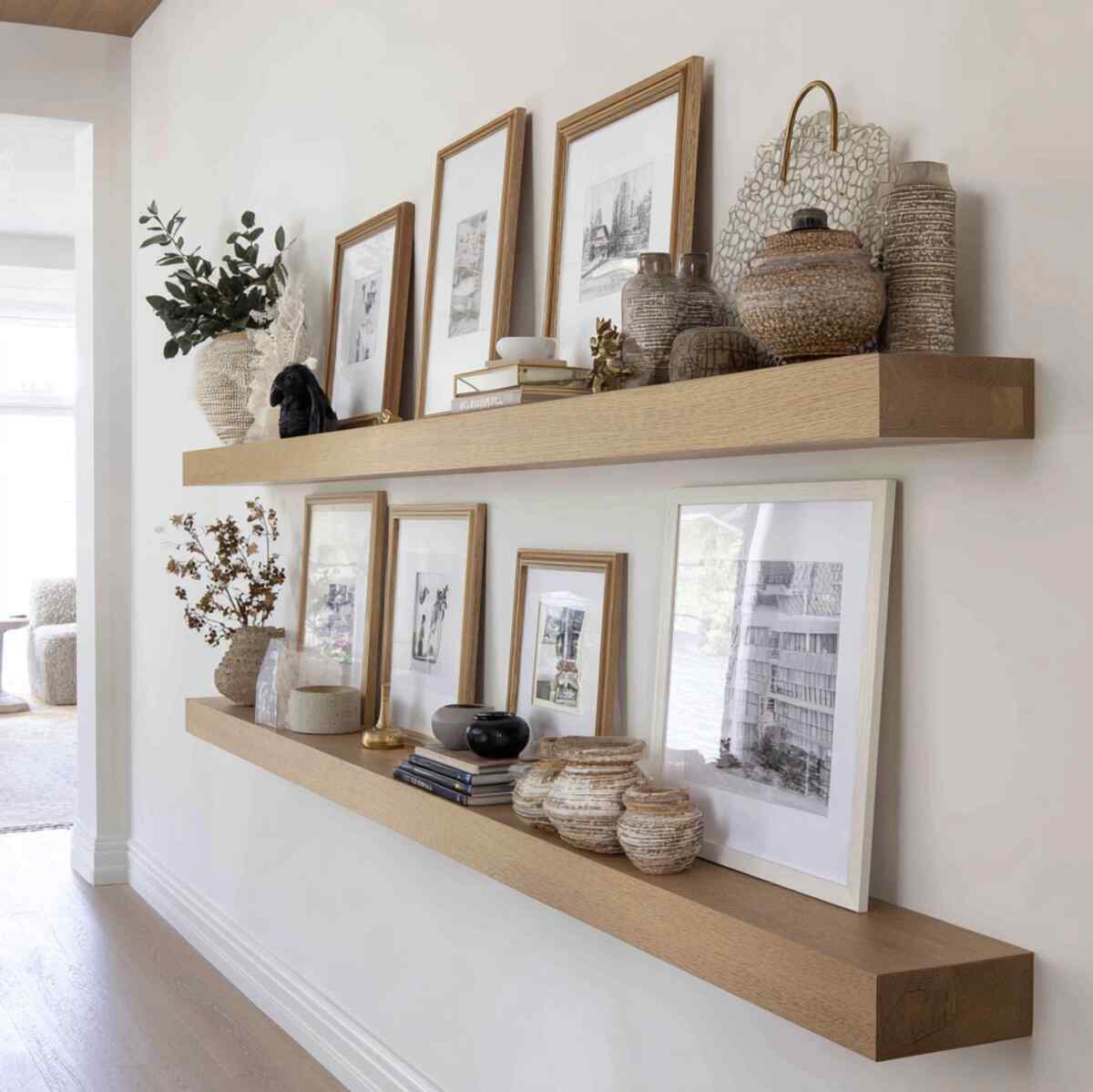 Floating wood shelves with framed art are one of the most timeless Hallway Shelf Display Ideas because they add warmth without taking up floor space. These shelves help turn a plain hallway into a visual gallery by displaying photos, prints, or illustrations that reflect your style.