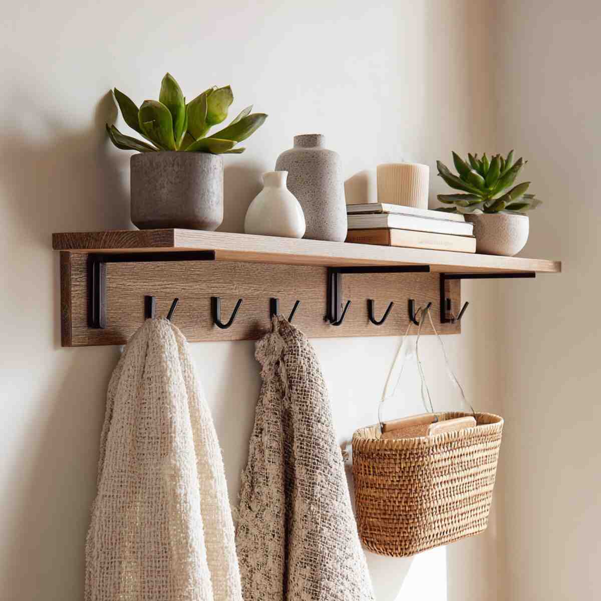 The shelf holds décor or essentials, while hooks keep keys, bags, or hats organized. As Hallway Shelf Display Ideas, they are important because they improve hallway function without adding bulk or clutter.