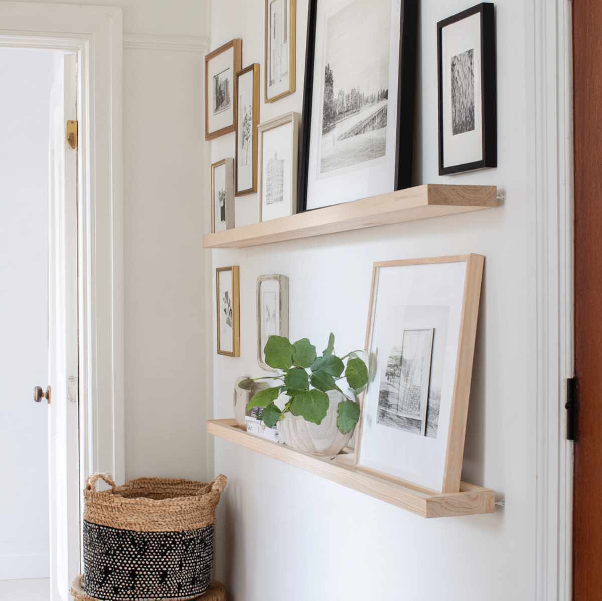 Picture ledge shelves are flexible Hallway Shelf Display Ideas that allow you to easily change photos and artwork without extra wall damage.
