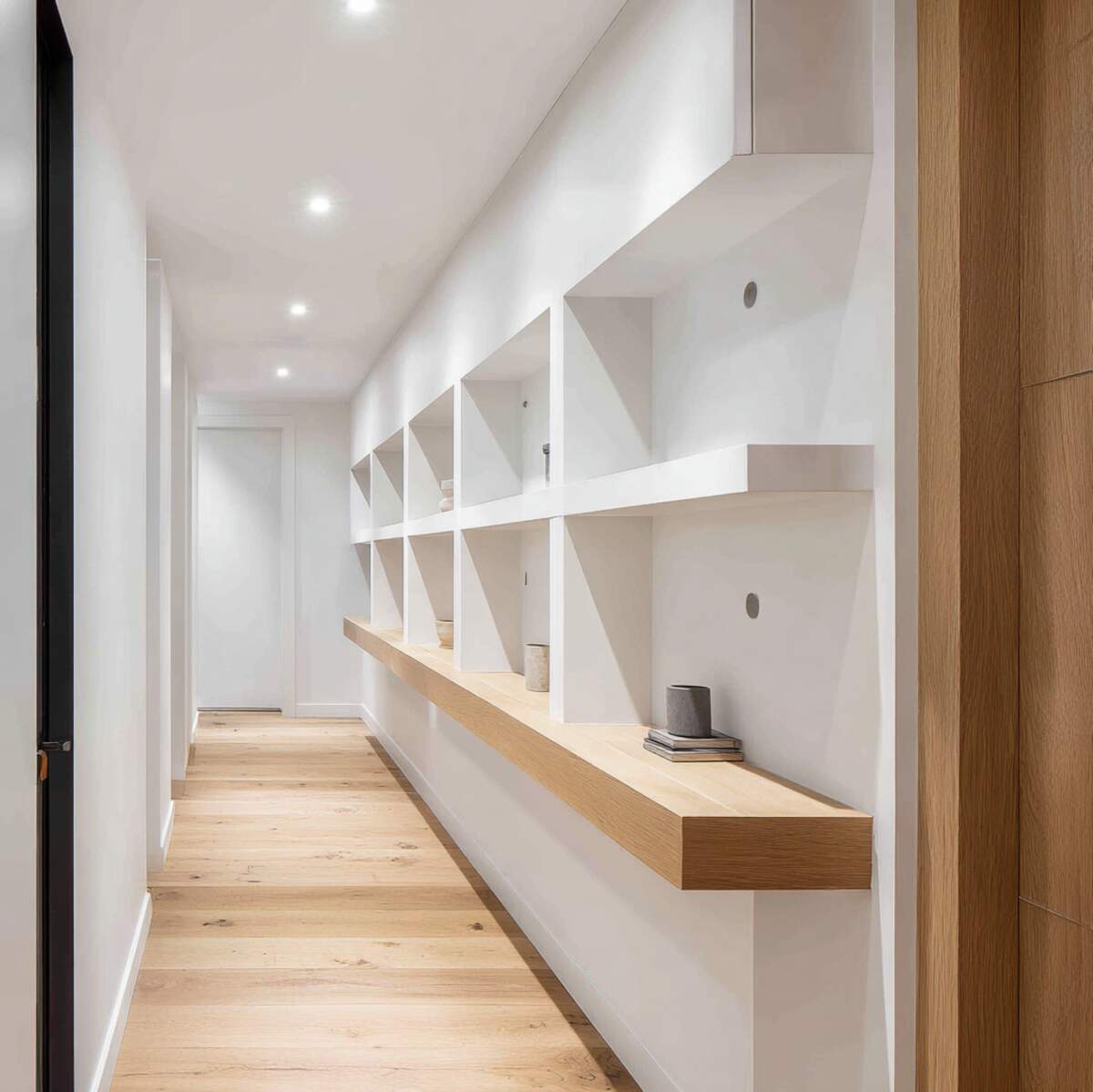 Built-in recessed shelves are seamless Hallway Shelf Display Ideas that sit flush with the wall. They offer display space without protruding into the walkway, which is ideal for busy hallways.