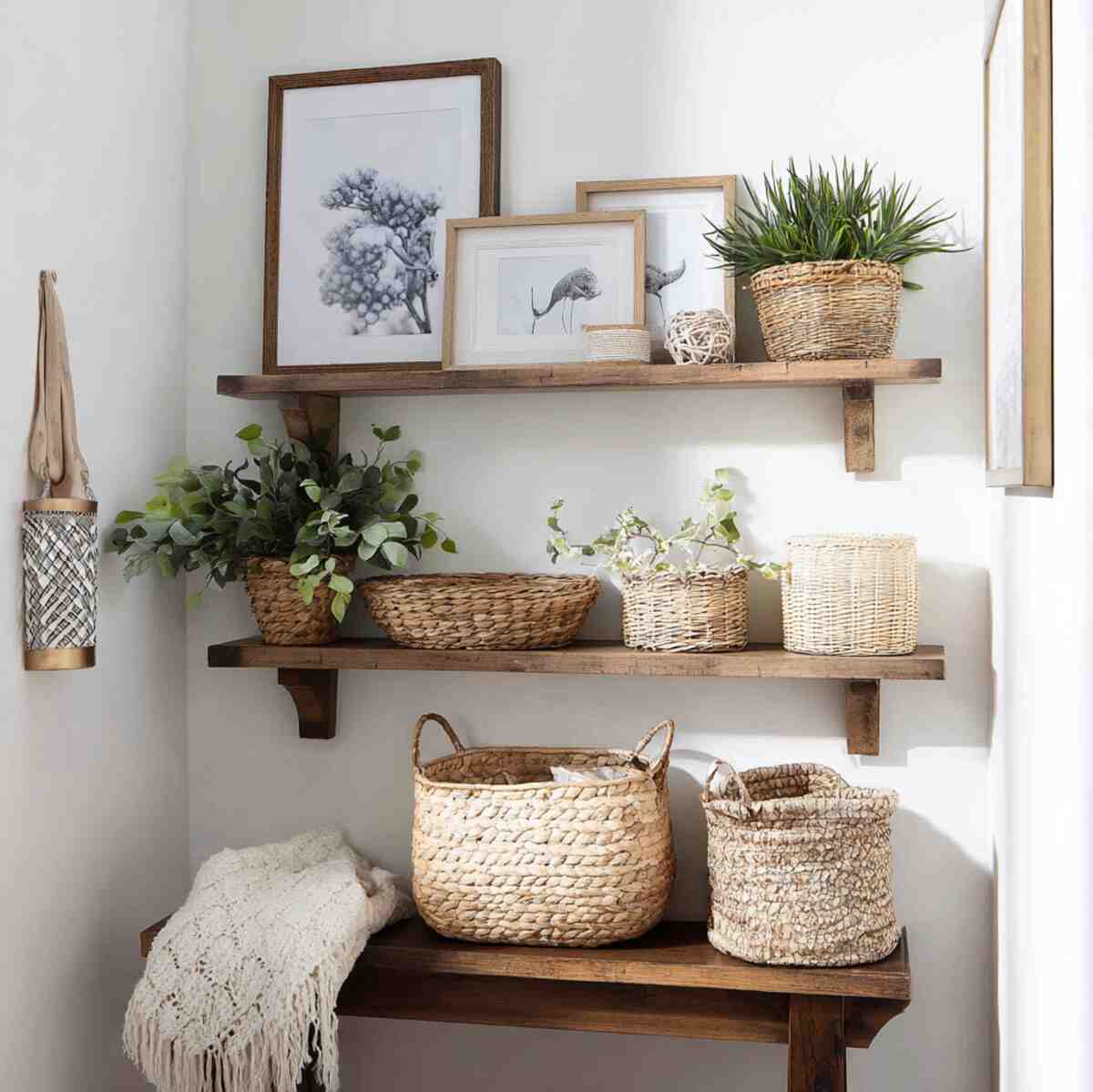 Rustic shelves with baskets bring texture and warmth to Hallway Shelf Display Ideas, especially in cozy or traditional homes.