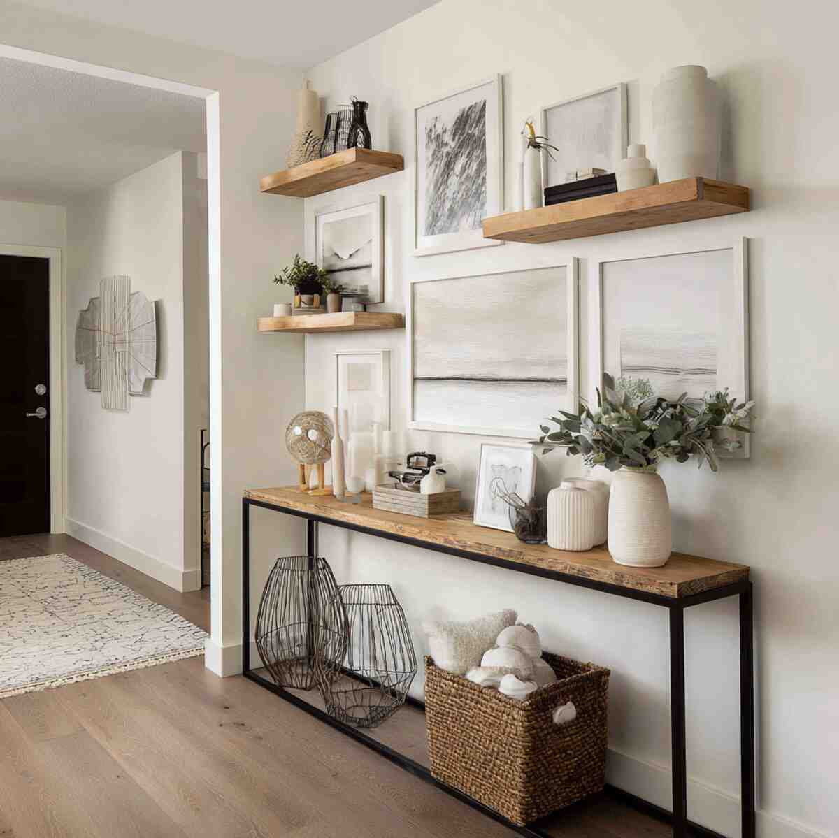 Their strong lines create contrast against light-colored walls, making the display stand out without being overwhelming. As Hallway Shelf Display Ideas, they are important because they offer durability and style while keeping the hallway visually organized.