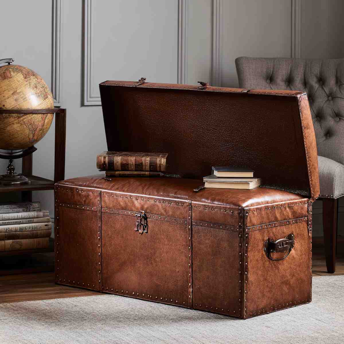 An ottoman trunk with a hinged lid offers a traditional yet timeless hidden storage solution. The sturdy design can hold heavier items like blankets or winter clothes while doubling as extra seating.