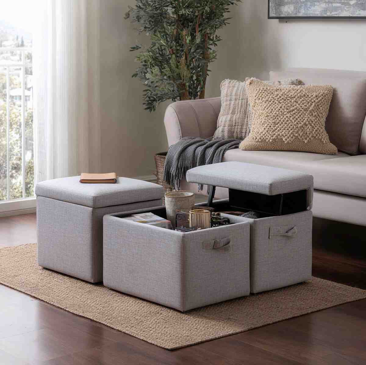 A nested ottoman set hides smaller ottomans inside a larger one, saving space and adding surprise storage.