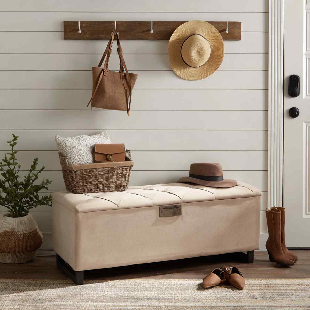 A storage bench ottoman by the entryway keeps shoes, umbrellas, and bags hidden out of sight. Its long design offers both seating and storage, making it perfect for organizing a busy household.