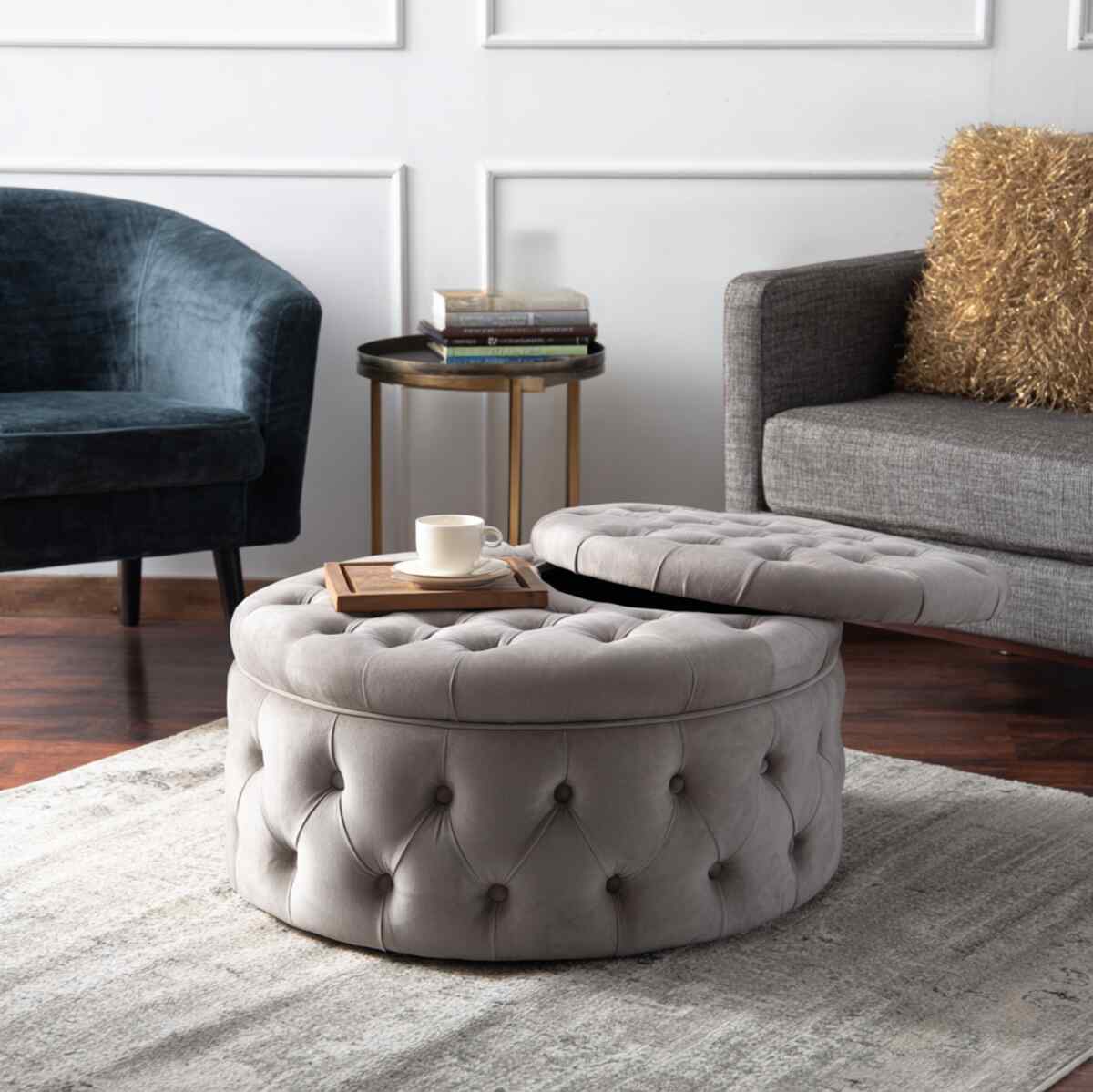 A round tufted ottoman looks elegant but secretly hides a deep storage compartment beneath its cushion.