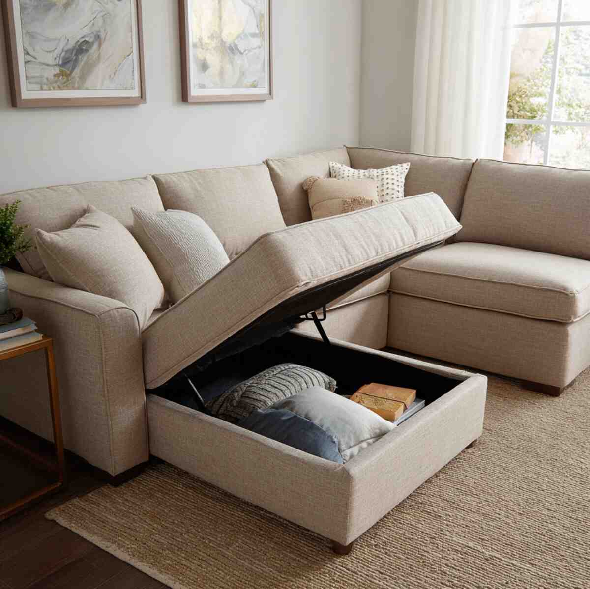 A sectional sofa ottoman with built-in storage adds both comfort and practicality to your living room. It serves as a footrest, extra seat, and hidden storage for cushions, toys, or throws.