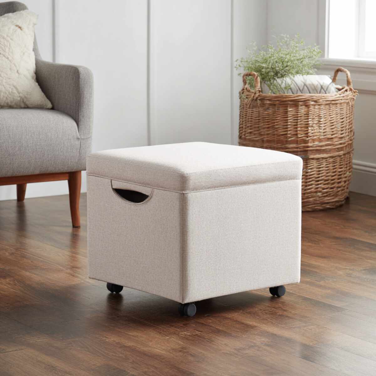A rolling storage ottoman combines mobility and hidden storage in one stylish piece. The wheels allow you to move it easily between rooms, while the inside compartment keeps clutter out of sight.