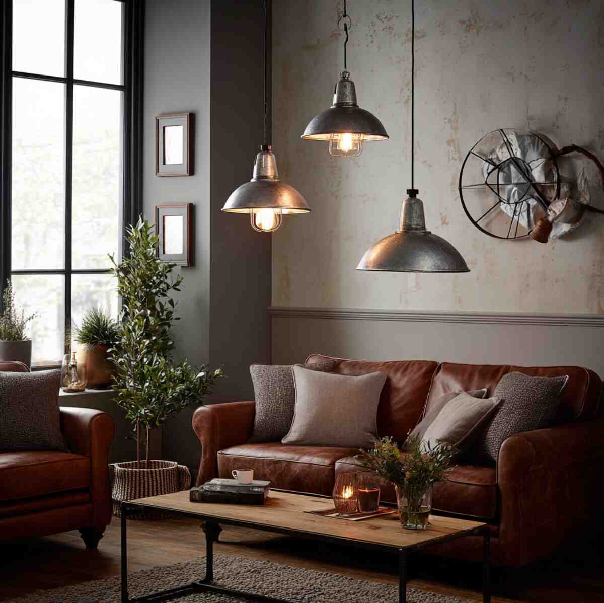Factory-style pendant lights are a defining element in Industrial Living Room Decor Ideas, bringing functional and stylish lighting overhead.