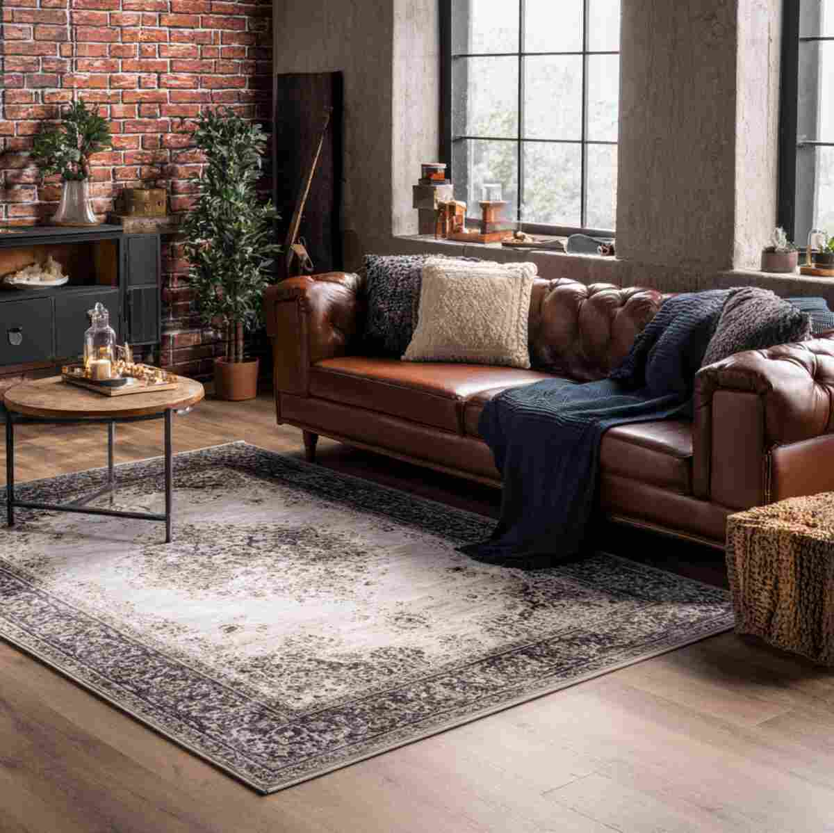 A rustic area rug adds softness and warmth to Industrial Living Room Decor Ideas, balancing the harder elements like concrete, brick, and metal.