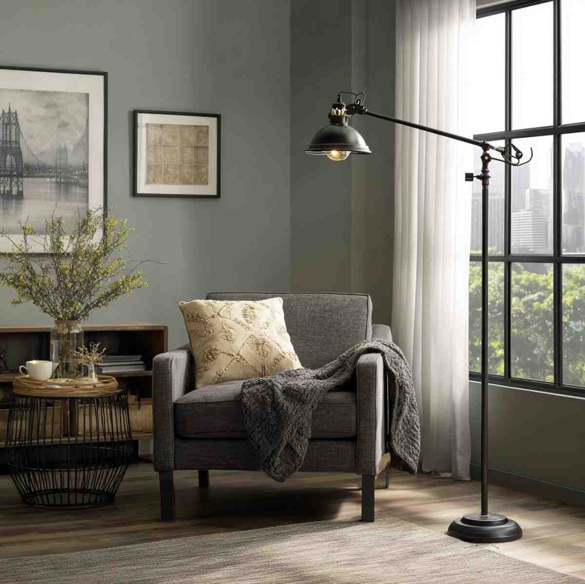 A steel floor lamp is both functional and decorative, perfectly fitting into Industrial Living Room Decor Ideas.