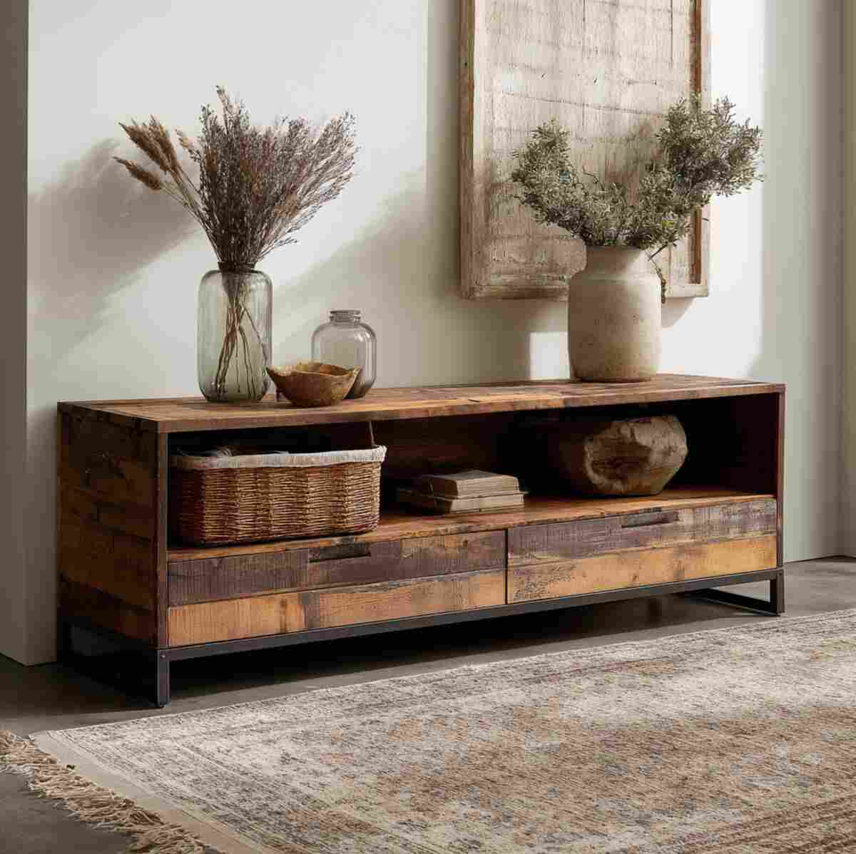 A distressed wood TV stand ties together Industrial Living Room Decor Ideas by adding warmth and rustic charm.