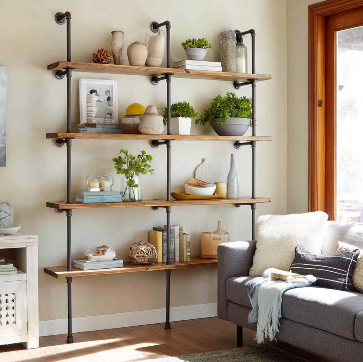 These shelves are often made from black iron pipes and wooden planks, creating a sturdy yet stylish look.