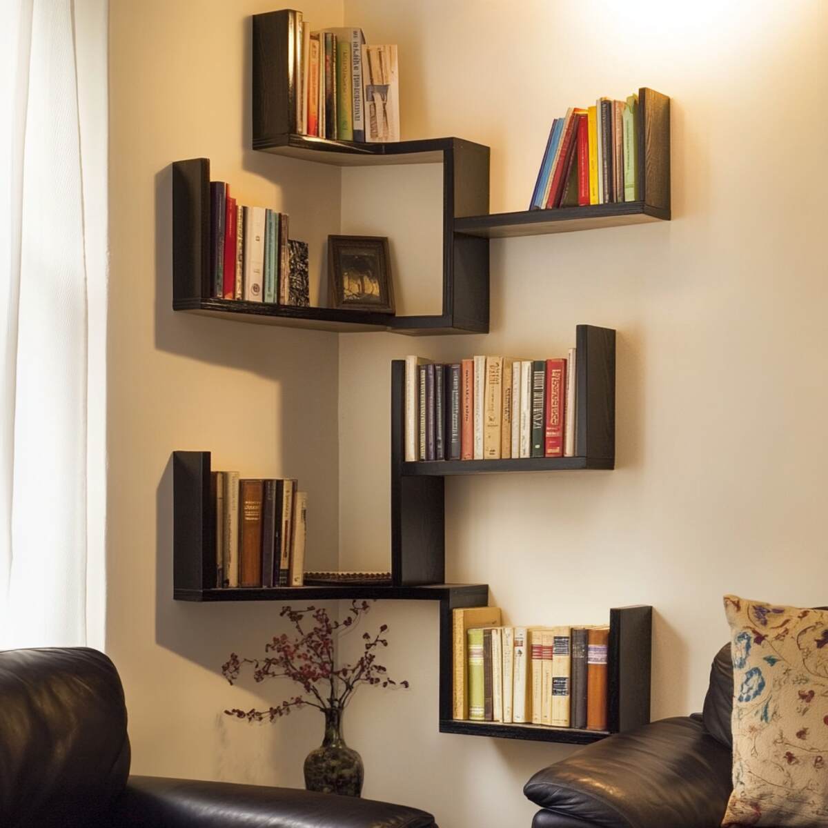 A geometric corner bookshelf features angular shapes and innovative designs that turn your corner into a statement piece.