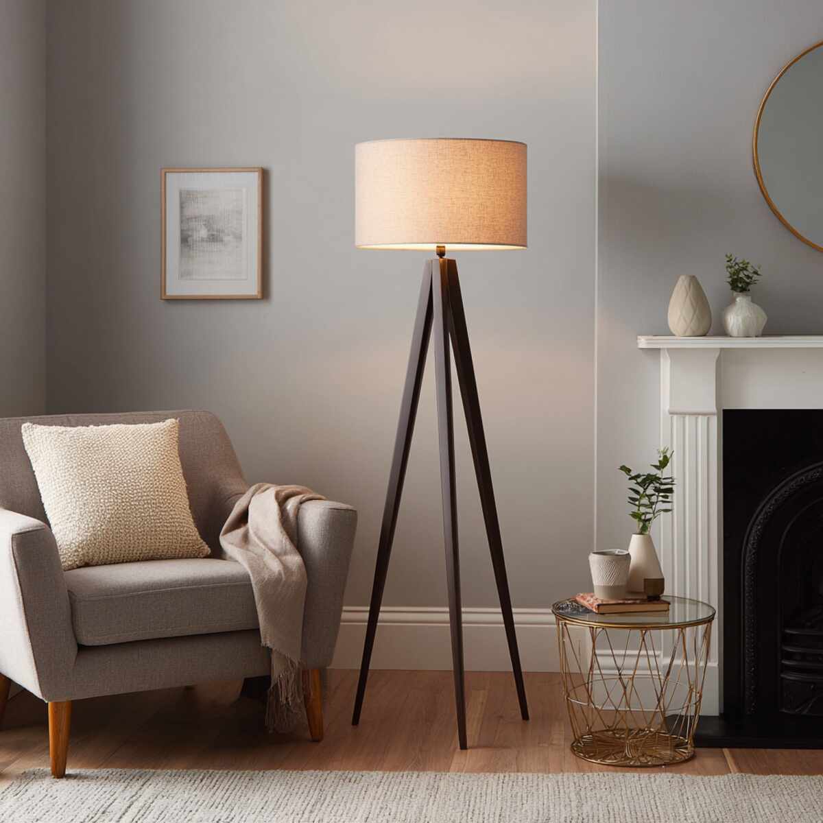A tall tripod floor lamp brings both balance and height to a living room corner. Its three-legged design adds a stylish touch while keeping the lamp stable on uneven floors.