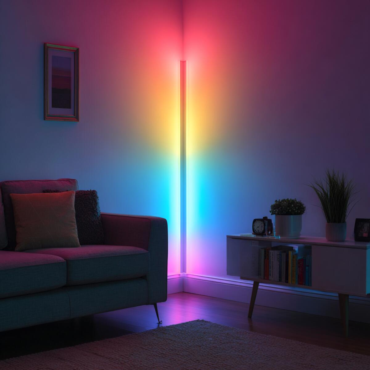 A smart color-changing lamp transforms a plain corner into a vibrant focal point. You can adjust colors and brightness using an app or voice control.