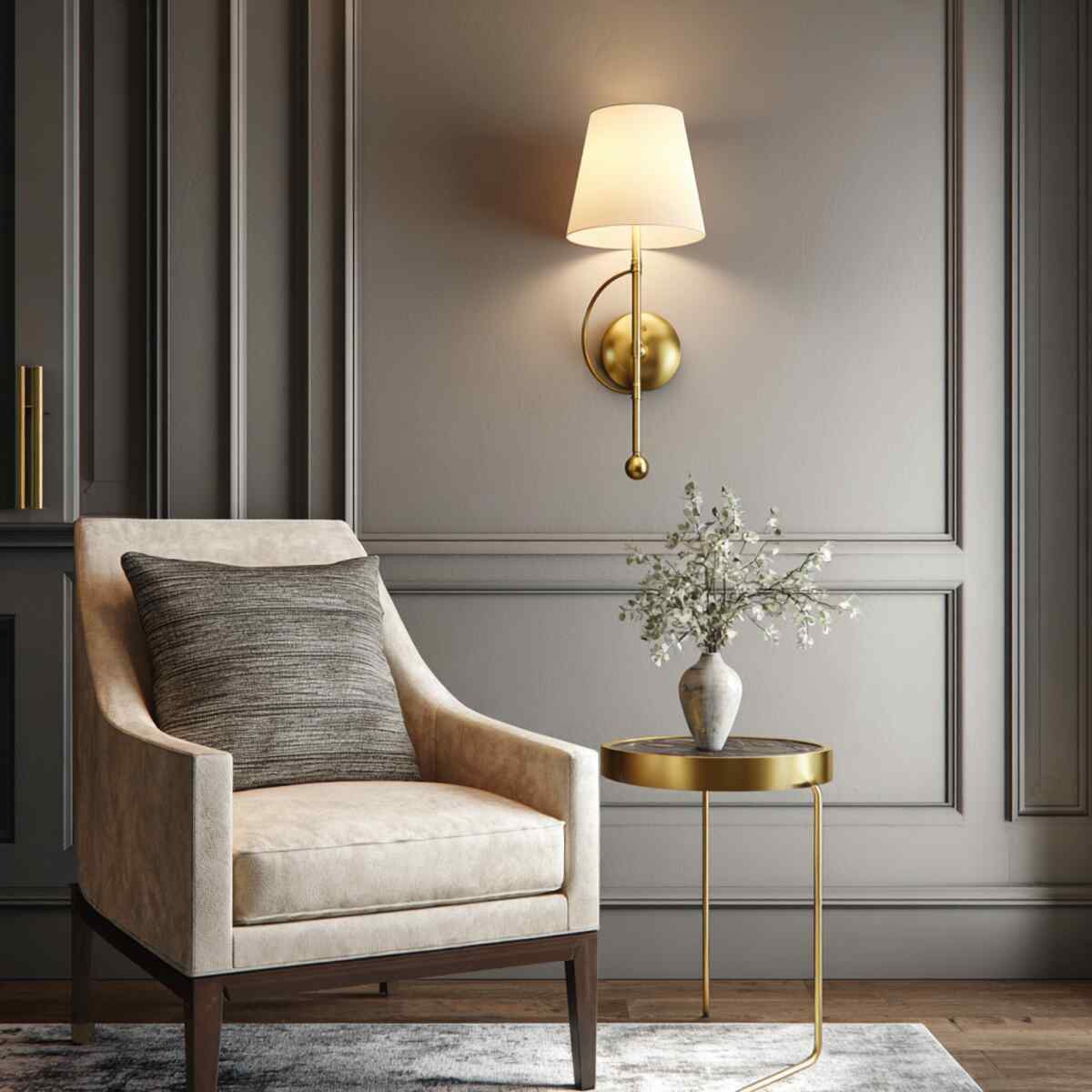 A corner wall-mounted sconce lamp saves floor space while adding stylish illumination.