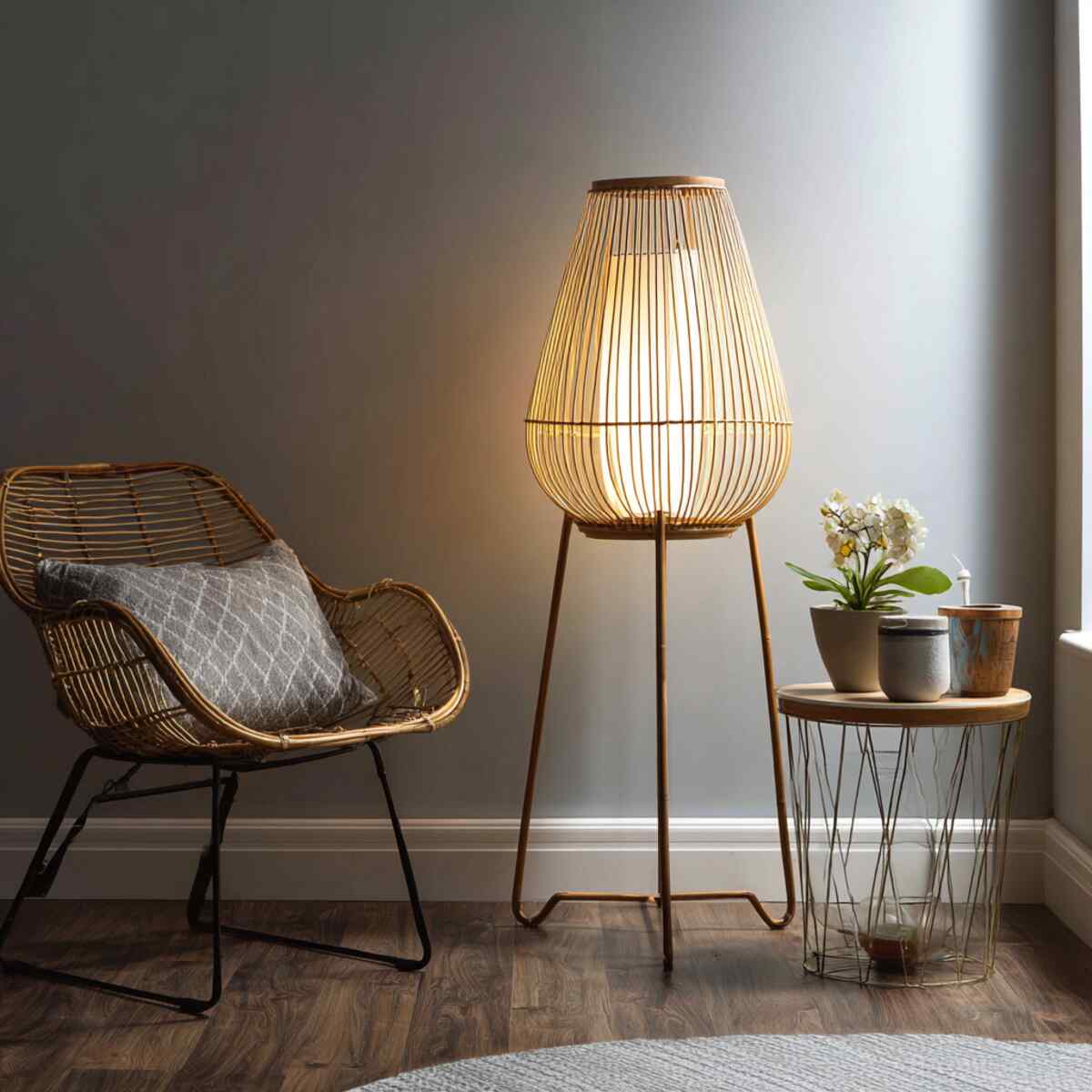 A rattan floor lamp adds a soft, warm glow and a touch of natural charm. Its woven design casts beautiful patterns of light and shadow around the room.