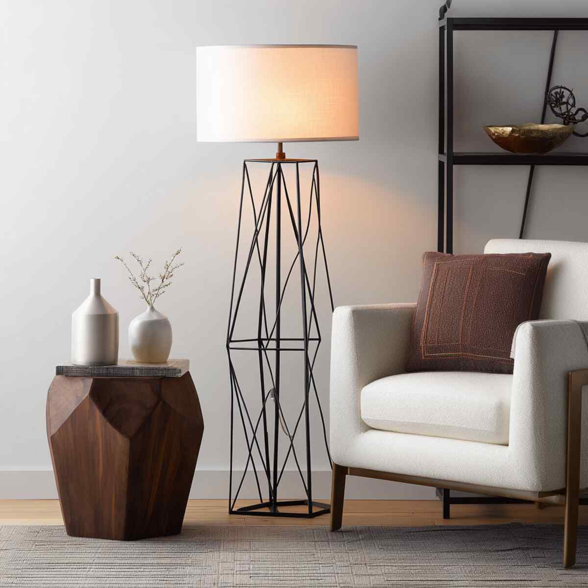 A modern geometric frame lamp stands out as an art piece in any living room corner.