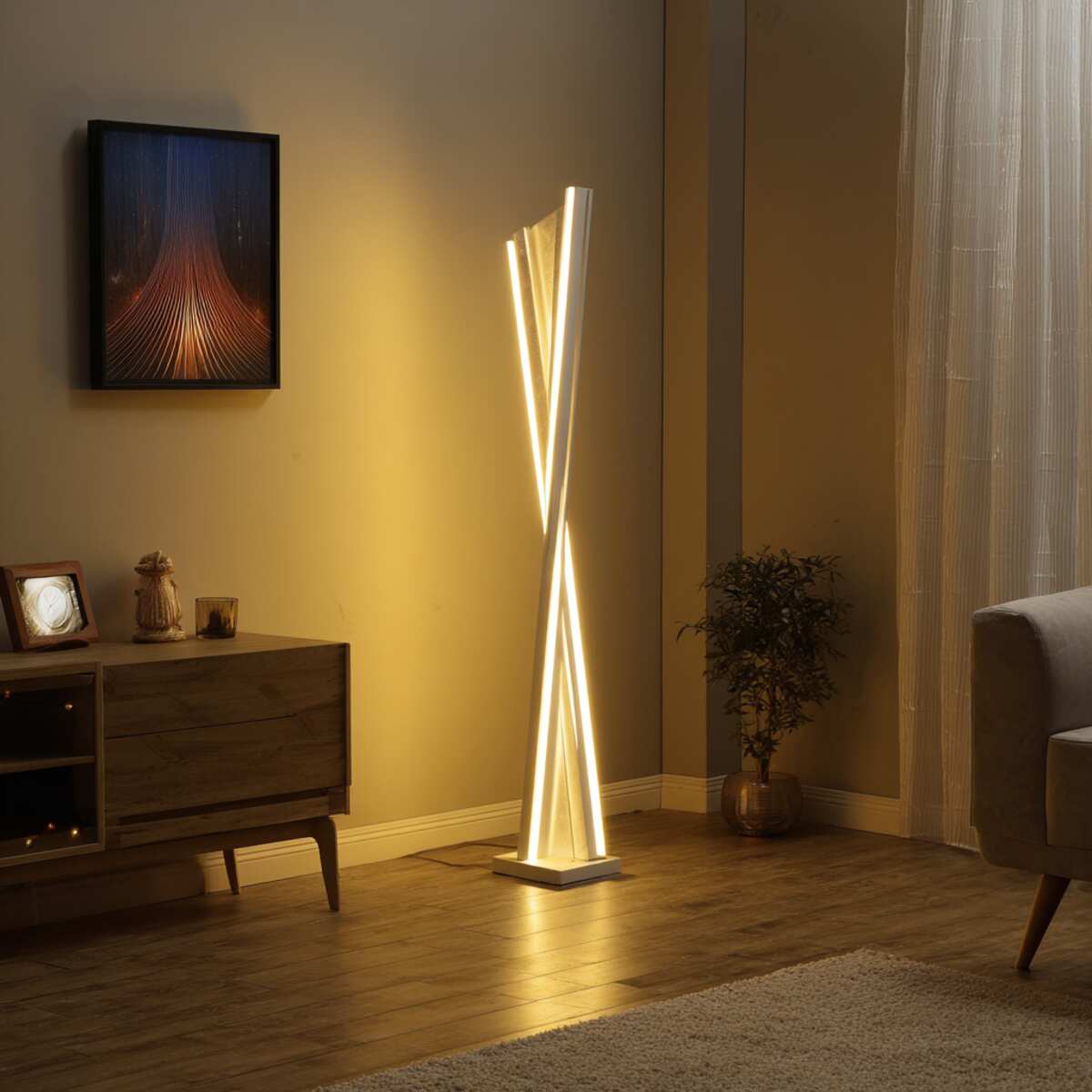 A corner LED strip floor lamp fits neatly into tight spaces, giving a modern, sleek look.
