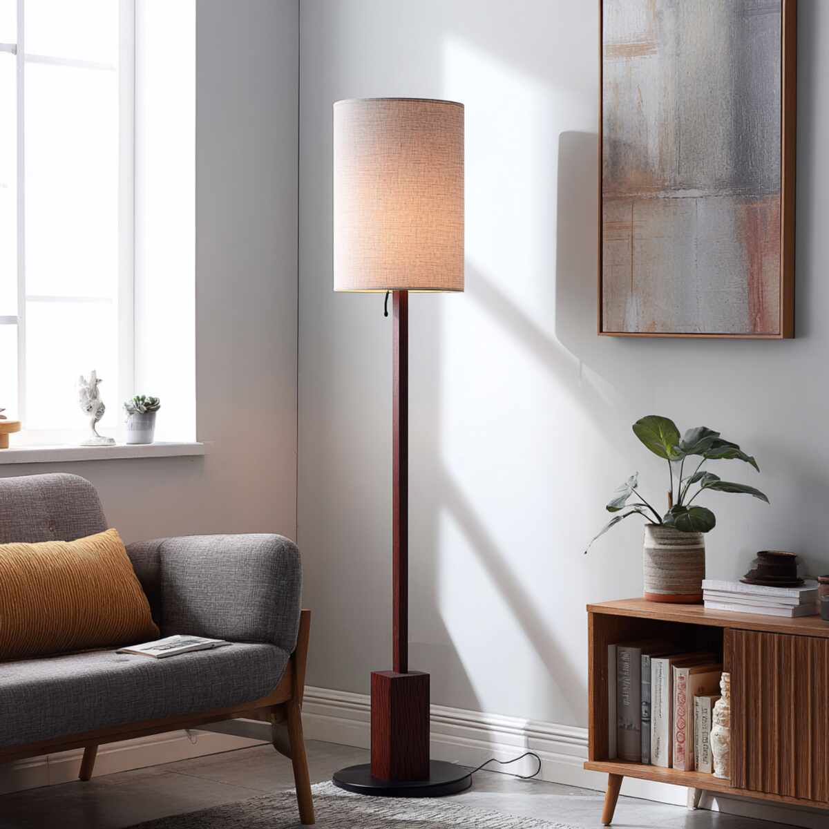 A wooden post lamp with a soft fabric shade brings a natural, warm vibe to any living room corner.