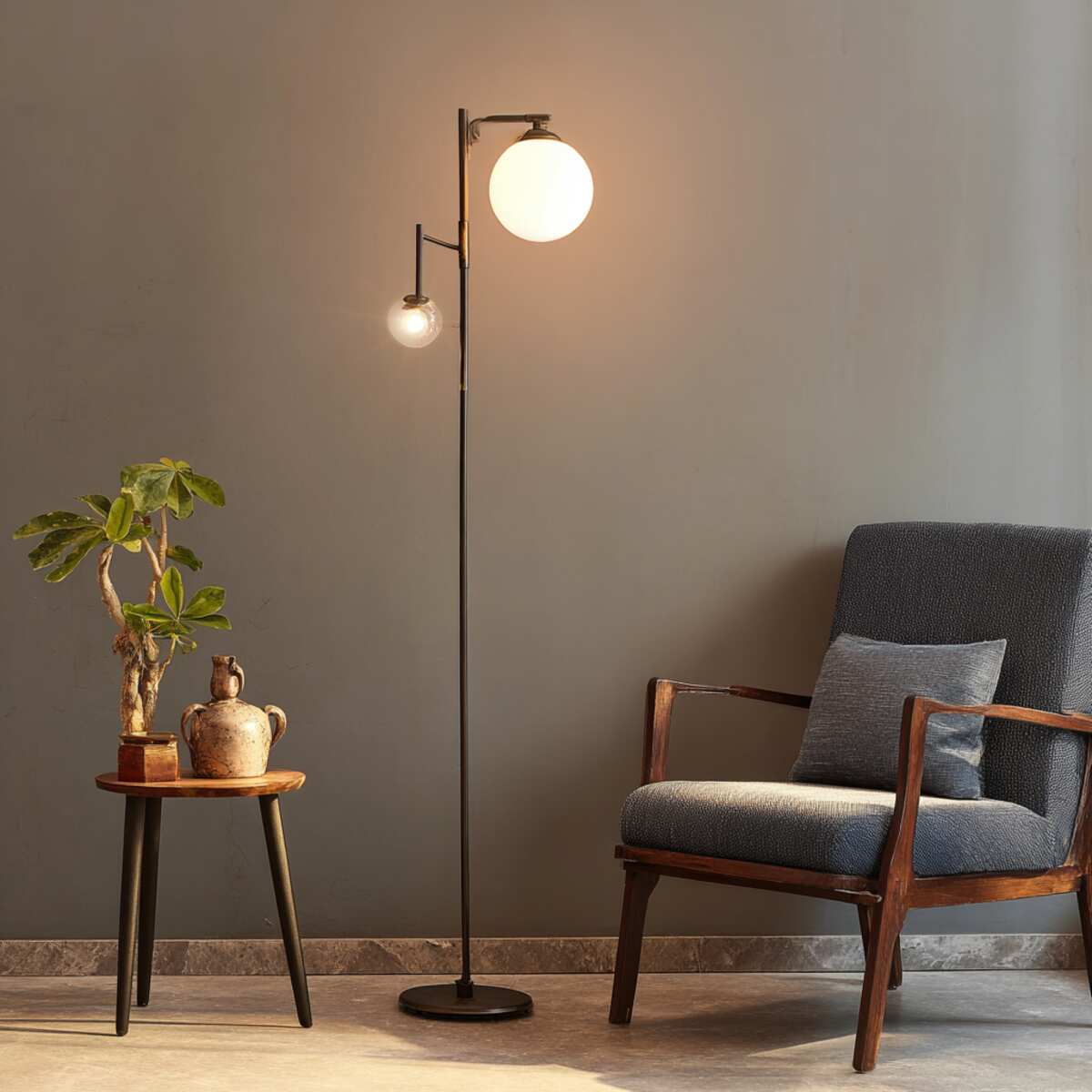 A glass globe lamp adds elegance and softness to a living room corner. Its round shade diffuses light evenly, creating a warm and welcoming atmosphere.