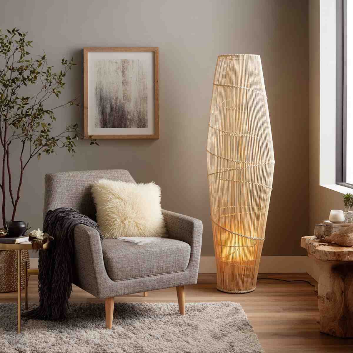 A bamboo standing lamp brings a natural and eco-friendly touch to your living room.