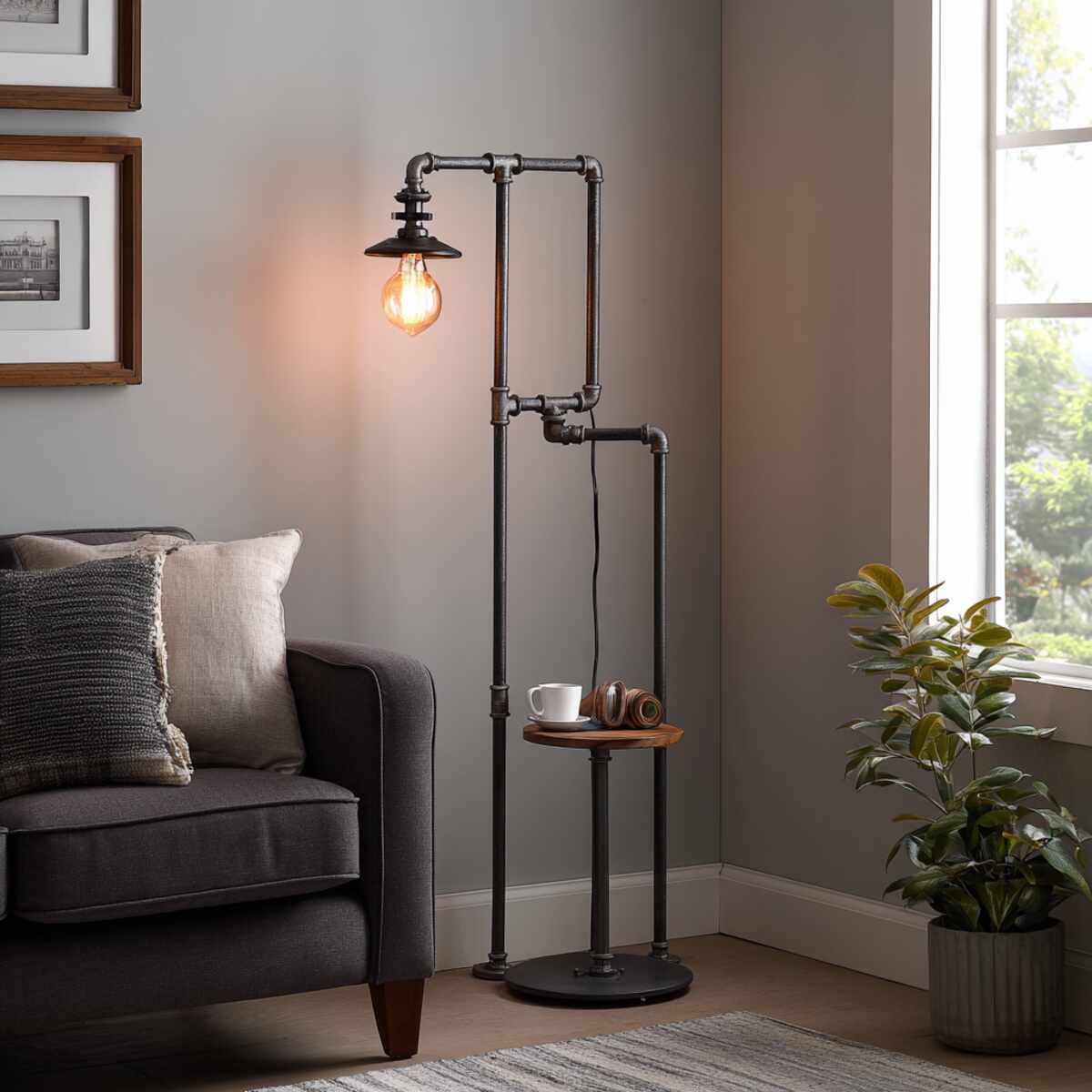 An industrial pipe-style lamp adds a raw, edgy character to a living room corner. Its exposed metal and vintage bulbs make it a bold decor feature.