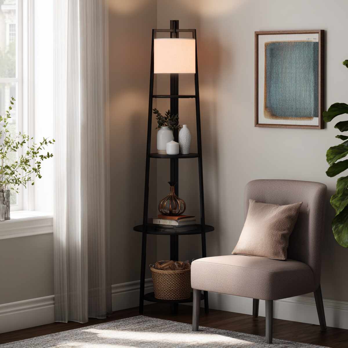 A corner shelf floor lamp combines lighting with extra space for books, plants, or decor. It’s perfect for small living rooms where every inch matters.