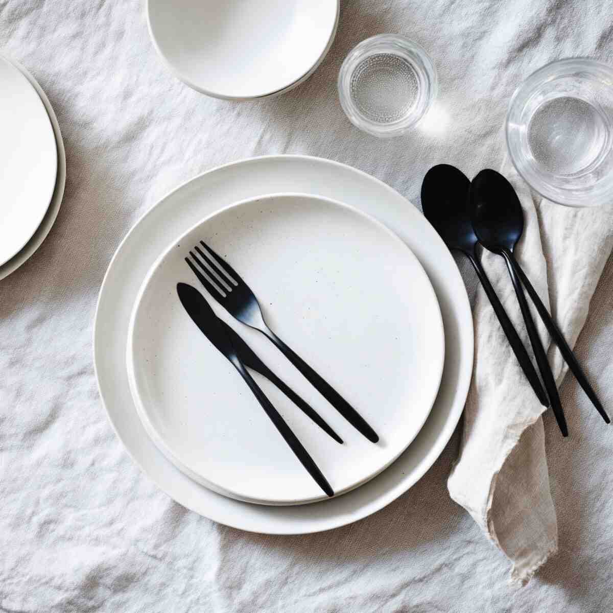 White plates paired with sleek black cutlery create a clean contrast that feels both modern and timeless.