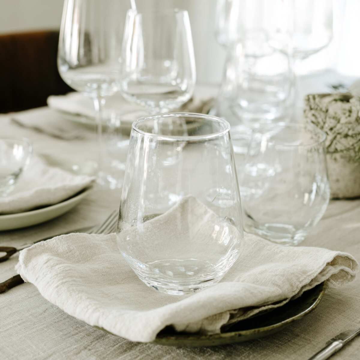 Transparent glassware combined with soft linen napkins offers a light and airy feel to the dining setup.