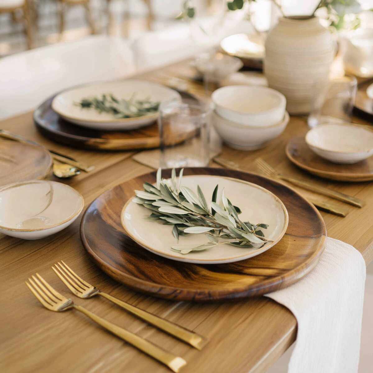 Wooden charger plates provide warmth while neutral dishes maintain the simplicity of the setting.