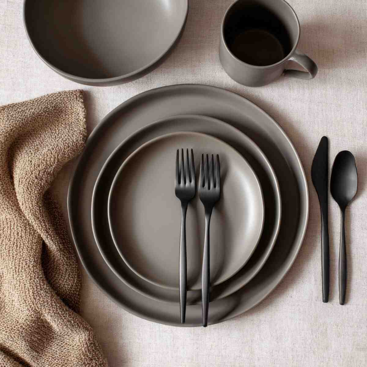 Matte ceramic plates paired with straightforward flatware deliver a modern and understated style.