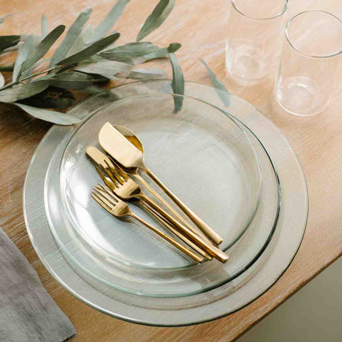 Glass plates reflect light beautifully, while metallic cutlery adds just the right touch of elegance.