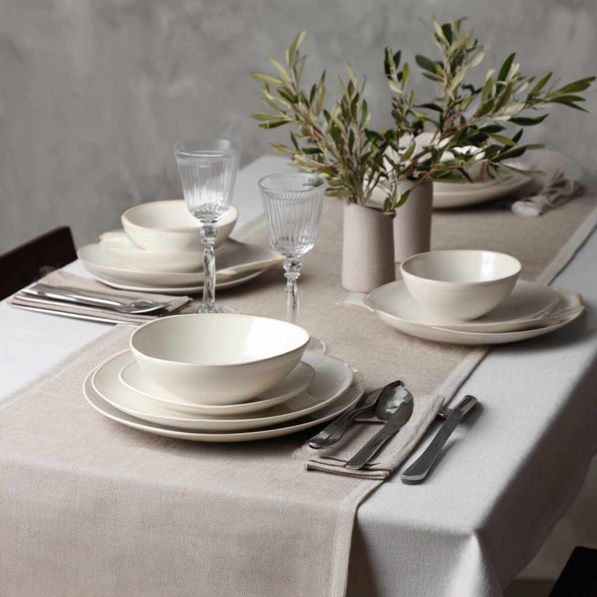 A neutral-toned table runner grounds the table design while plain dinnerware ensures the look stays minimal.