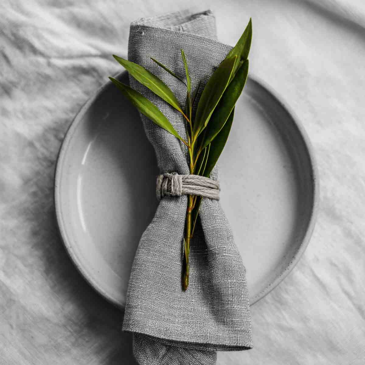 Placing a neatly folded napkin with one greenery stem on top adds freshness without excess decoration.