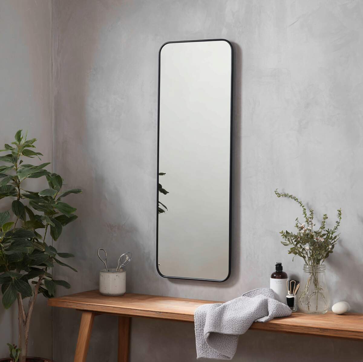 The thin black metal frame mirror adds just enough structure without overwhelming the design.