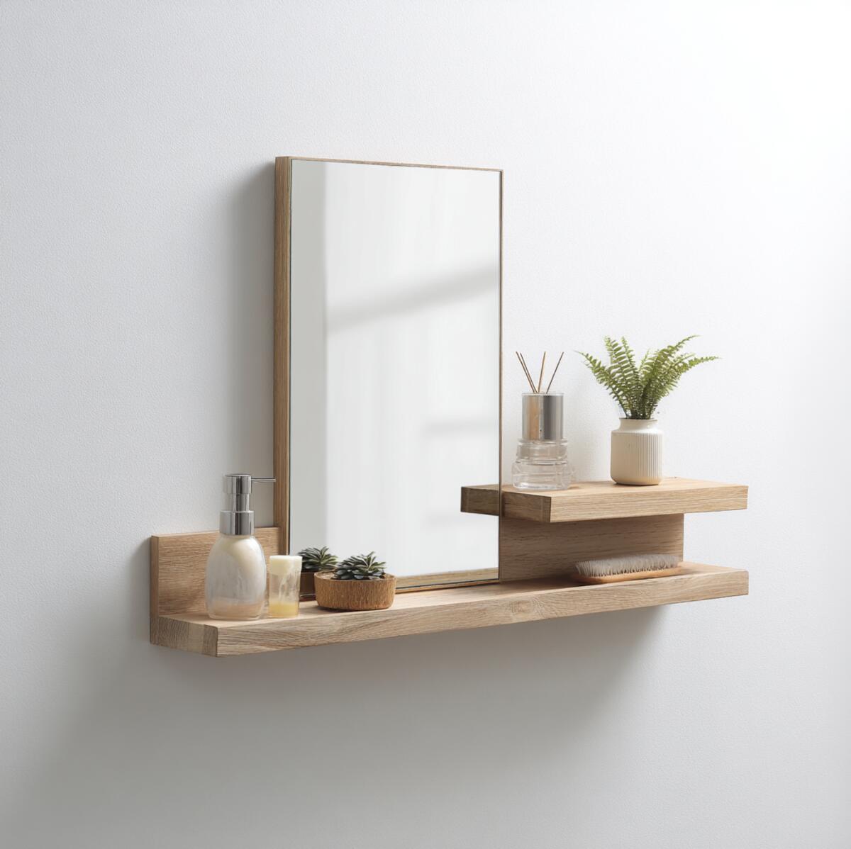 A floating shelf mirror combo merges storage and reflection into one neat unit. It’s an ideal Minimalist Vanity Mirror Idea for those who value functionality without visual clutter.