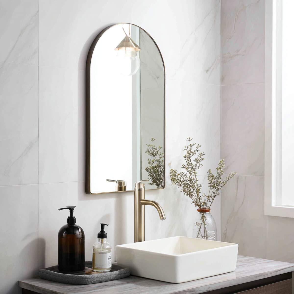 The arched minimal vanity mirror adds a soft architectural element to your space while keeping the look understated.