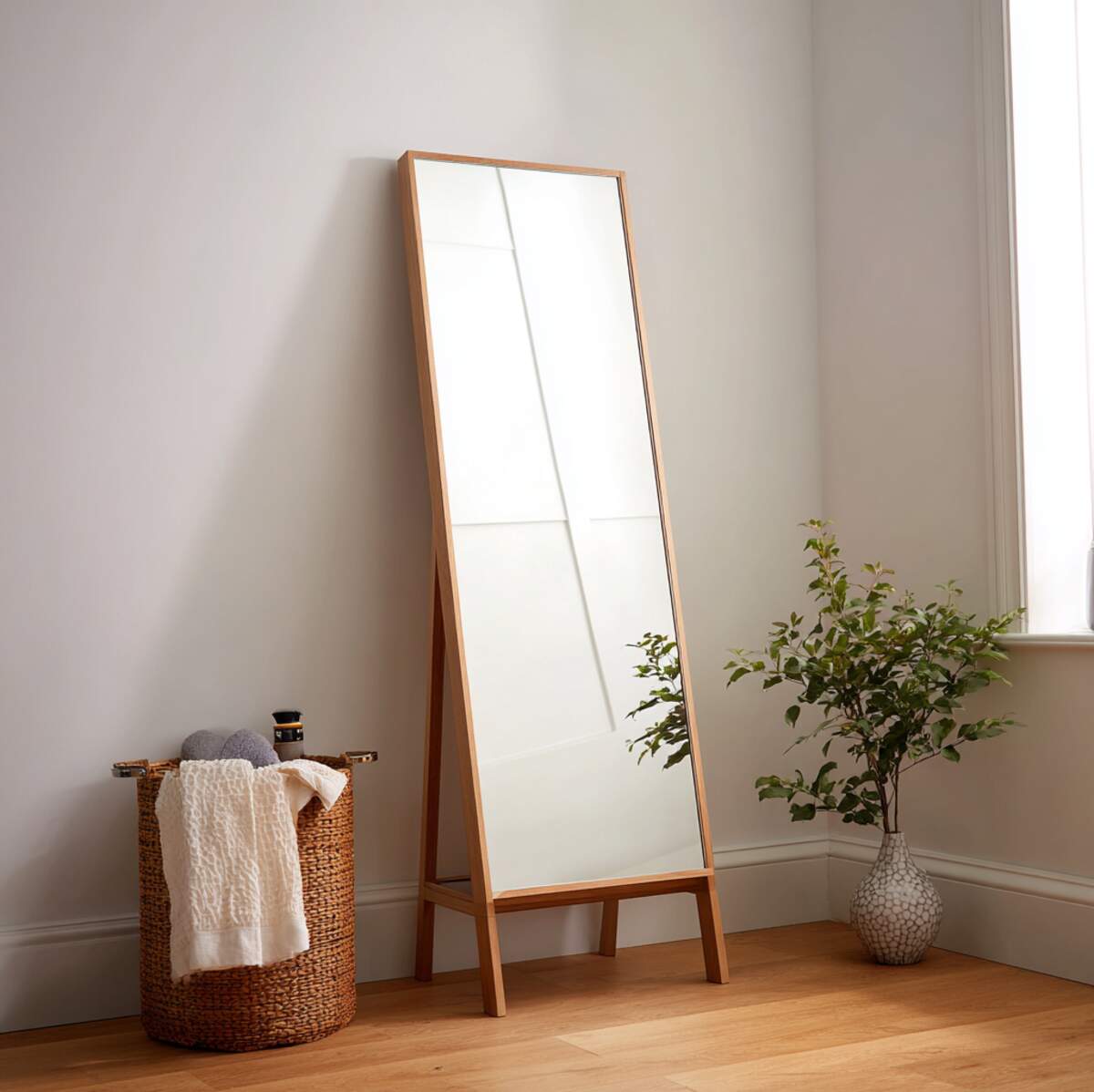 A full-length leaning mirror adds both drama and depth to a minimalist room. Its freestanding design removes the need for wall mounting, making it flexible yet effortlessly chic.