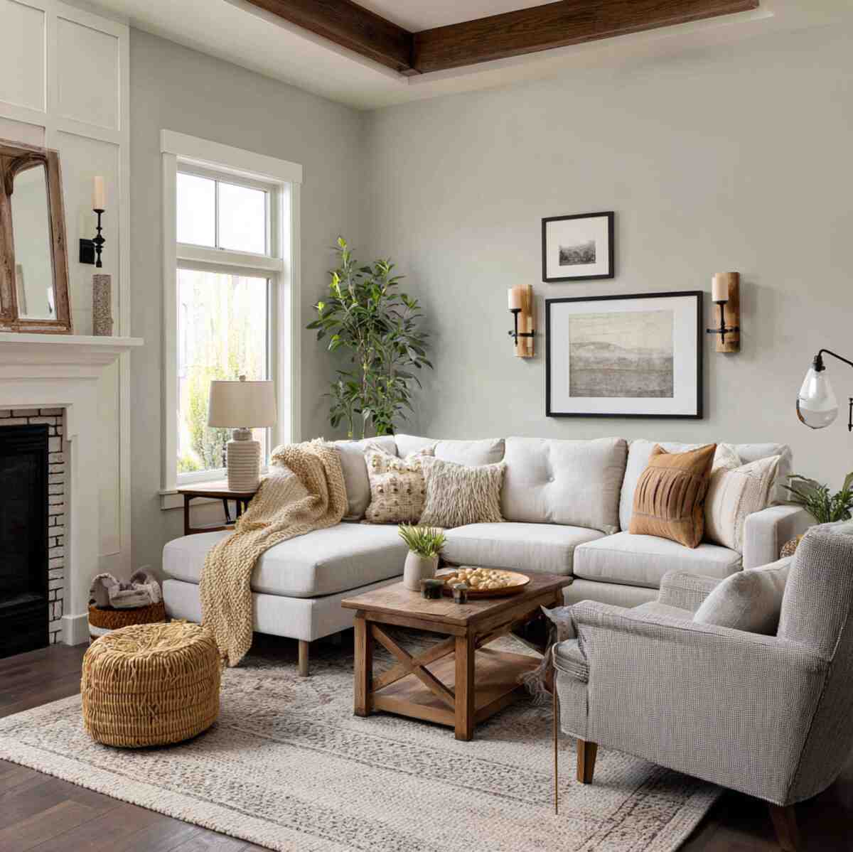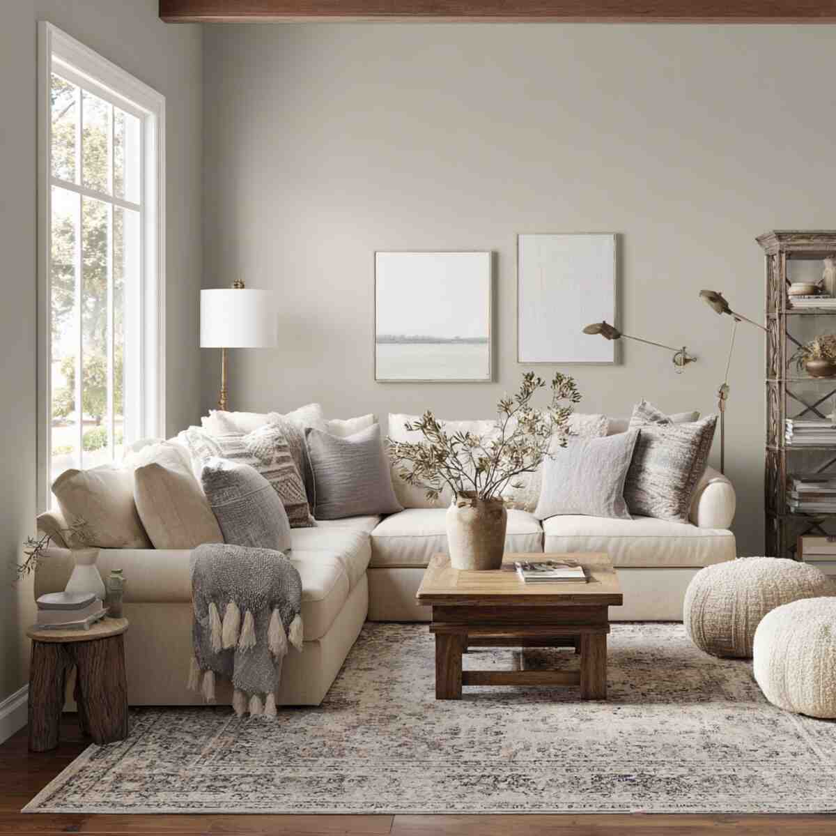 Light gray and warm tan balance cool and warm tones perfectly. This neutral duo is a favorite in Modern Farmhouse Living Room Color Ideas because it feels modern but still cozy.