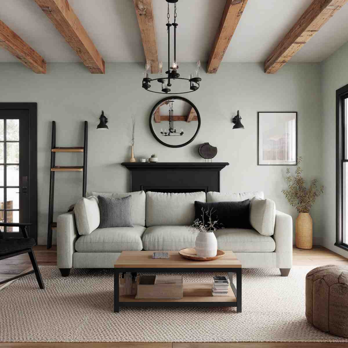 Pale sage and matte black bring a touch of contrast and modernity to farmhouse decor. In Modern Farmhouse Living Room Color Ideas, this pairing adds freshness while keeping the look elegant.