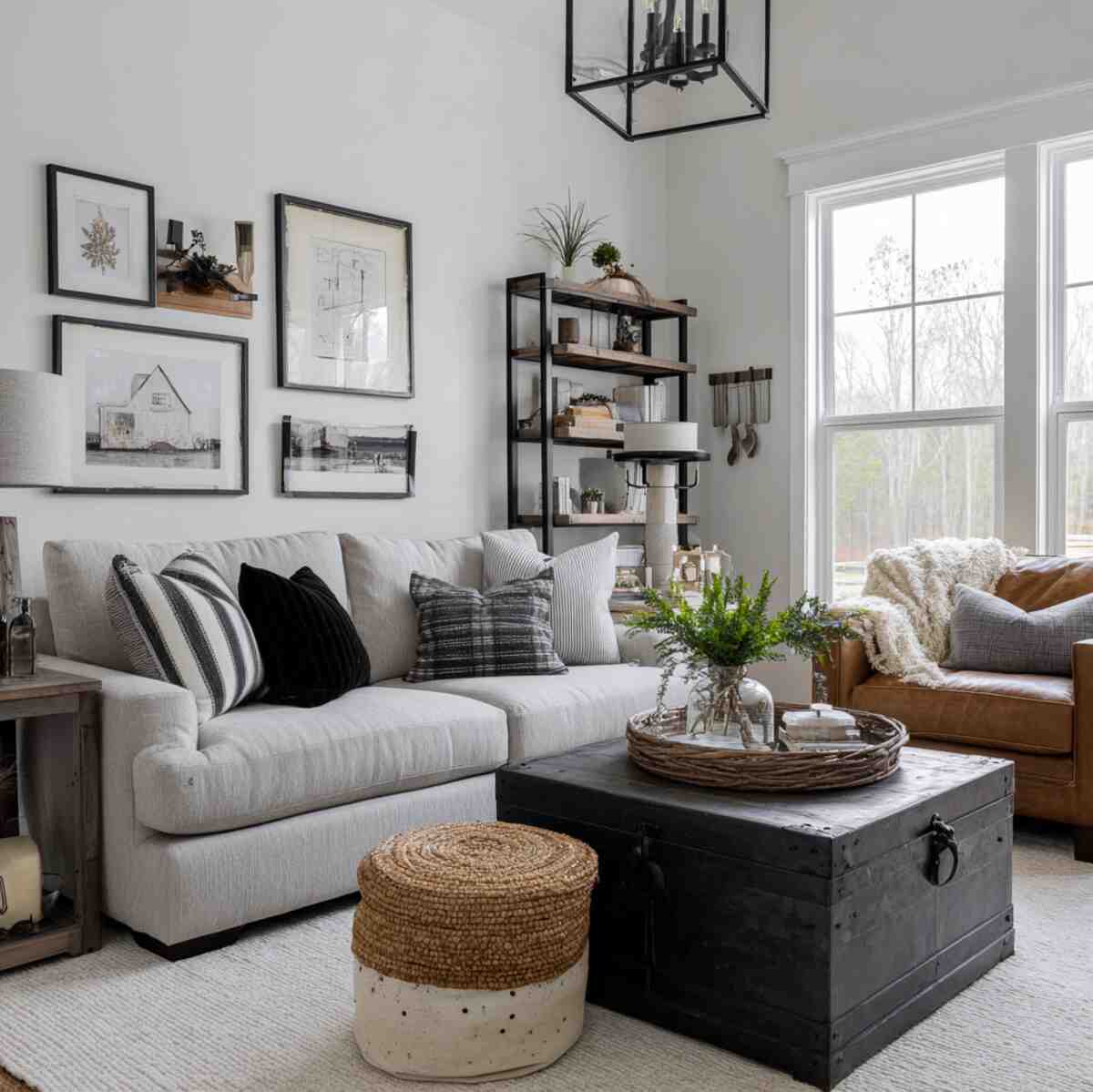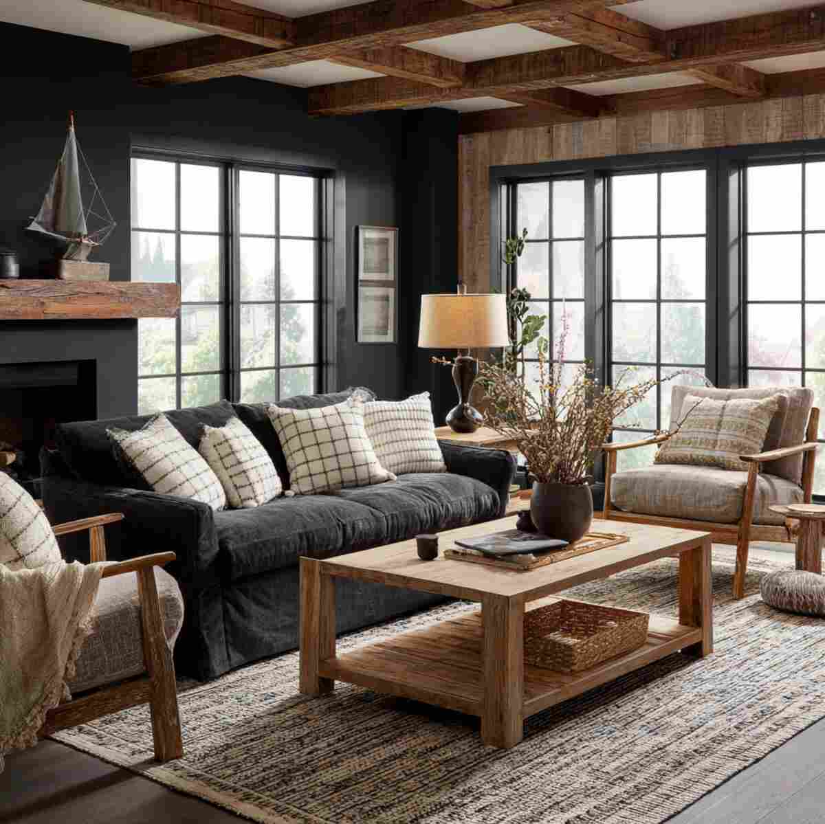 In Modern Farmhouse Living Room Color Ideas, this mix represents the perfect blend of industrial chic and rustic warmth. The natural wood softens the bold charcoal, making the room cozy yet stylish.