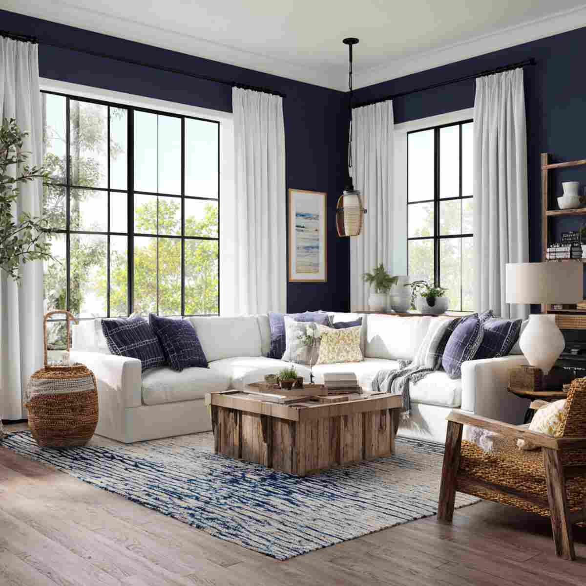 Navy blue and crisp white deliver a bold yet classic farmhouse look. This timeless combination works beautifully in Modern Farmhouse Living Room Color Ideas because it adds depth while keeping the space bright and fresh.